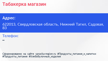 Табакерка, магазин по адресу 622013, Свердловская область, Нижний Тагил, Садовая, 83 в дальнейшем Организация, размещена в следующих категориях: