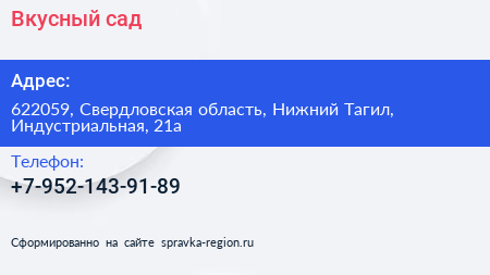 Вкусный сад по адресу 622059, Свердловская область, Нижний Тагил, Индустриальная, 21а в дальнейшем Организация, размещена в следующих категориях: