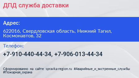 ДПД, служба доставки по адресу 622016, Свердловская область, Нижний Тагил, Космонавтов, 32 в дальнейшем Организация, размещена в следующих категориях: