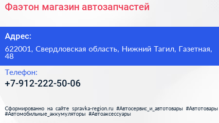 Фаэтон, магазин автозапчастей по адресу 622001, Свердловская область, Нижний Тагил, Газетная, 48 в дальнейшем Организация, размещена в следующих категориях: