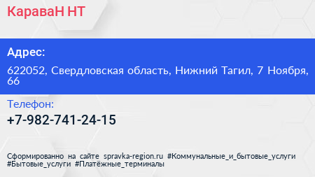 КараваН НТ по адресу 622052, Свердловская область, Нижний Тагил, 7 Ноября, 66 в дальнейшем Организация, размещена в следующих категориях: