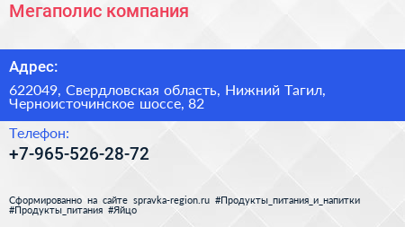Мегаполис, компания по адресу 622049, Свердловская область, Нижний Тагил, Черноисточинское шоссе, 82 в дальнейшем Организация, размещена в следующих категориях: