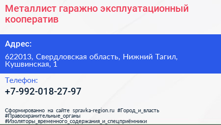 Металлист, гаражно-эксплуатационный кооператив по адресу 622013, Свердловская область, Нижний Тагил, Кушвинская, 1 в дальнейшем Организация, размещена в следующих категориях: