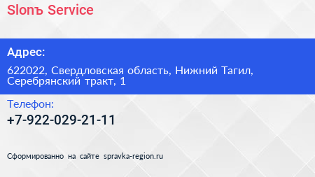 Slonъ Service по адресу 622022, Свердловская область, Нижний Тагил, Серебрянский тракт, 1 в дальнейшем Организация, размещена в следующих категориях: