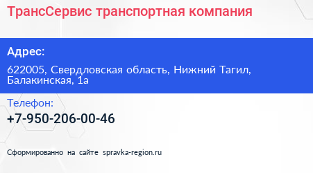 ТрансСервис, транспортная компания по адресу 622005, Свердловская область, Нижний Тагил, Балакинская, 1а в дальнейшем Организация, размещена в следующих категориях: