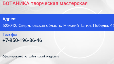 БОТАНИКА, творческая мастерская по адресу 622042, Свердловская область, Нижний Тагил, Победы, 46 в дальнейшем Организация, размещена в следующих категориях: