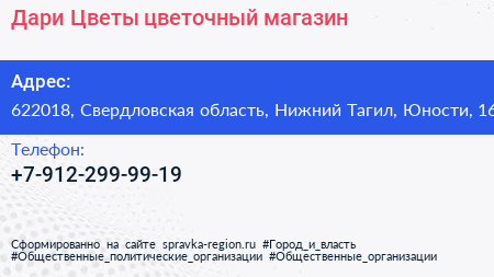 Дари Цветы, цветочный магазин по адресу 622018, Свердловская область, Нижний Тагил, Юности, 16 в дальнейшем Организация, размещена в следующих категориях: