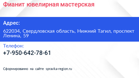 Фианит, ювелирная мастерская по адресу 622034, Свердловская область, Нижний Тагил, проспект Ленина, 59 в дальнейшем Организация, размещена в следующих категориях: