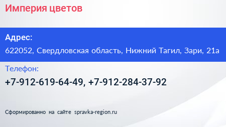 Империя цветов по адресу 622052, Свердловская область, Нижний Тагил, Зари, 21а в дальнейшем Организация, размещена в следующих категориях: