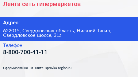 Лента, сеть гипермаркетов по адресу 622015, Свердловская область, Нижний Тагил, Свердловское шоссе, 31а в дальнейшем Организация, размещена в следующих категориях: