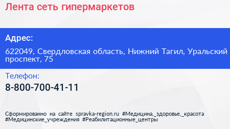 Лента, сеть гипермаркетов по адресу 622049, Свердловская область, Нижний Тагил, Уральский проспект, 75 в дальнейшем Организация, размещена в следующих категориях: