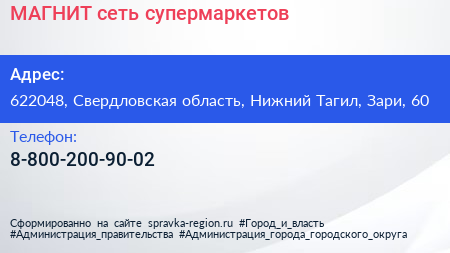 МАГНИТ, сеть супермаркетов по адресу 622048, Свердловская область, Нижний Тагил, Зари, 60 в дальнейшем Организация, размещена в следующих категориях: