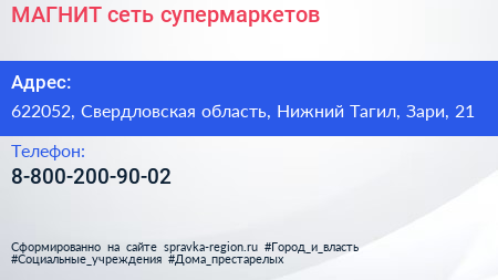 МАГНИТ, сеть супермаркетов по адресу 622052, Свердловская область, Нижний Тагил, Зари, 21 в дальнейшем Организация, размещена в следующих категориях: