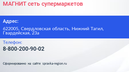 МАГНИТ, сеть супермаркетов по адресу 622005, Свердловская область, Нижний Тагил, Гвардейская, 23а в дальнейшем Организация, размещена в следующих категориях: