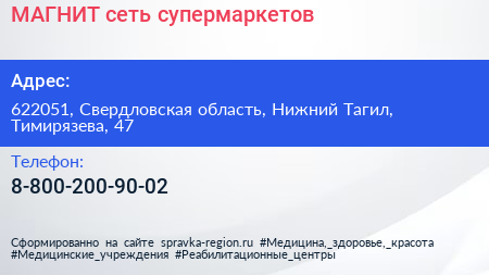 МАГНИТ, сеть супермаркетов по адресу 622051, Свердловская область, Нижний Тагил, Тимирязева, 47 в дальнейшем Организация, размещена в следующих категориях: