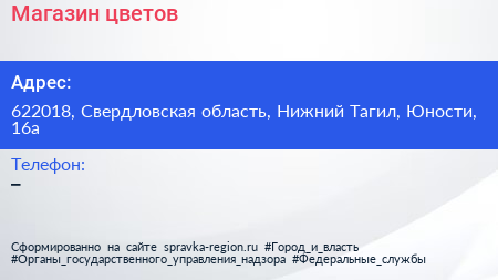Магазин цветов по адресу 622018, Свердловская область, Нижний Тагил, Юности, 16а в дальнейшем Организация, размещена в следующих категориях: