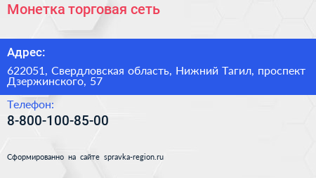 Монетка, торговая сеть по адресу 622051, Свердловская область, Нижний Тагил, проспект Дзержинского, 57 в дальнейшем Организация, размещена в следующих категориях: