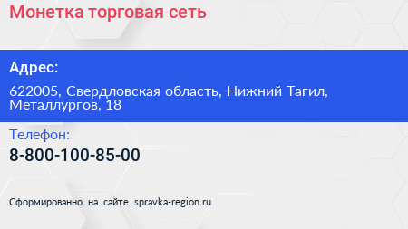 Монетка, торговая сеть по адресу 622005, Свердловская область, Нижний Тагил, Металлургов, 18 в дальнейшем Организация, размещена в следующих категориях: