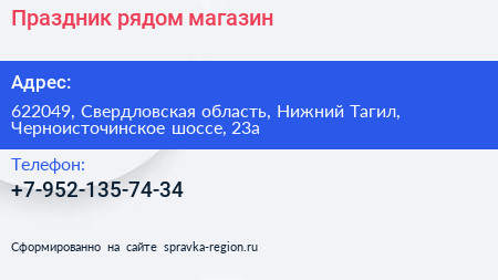 Праздник рядом, магазин по адресу 622049, Свердловская область, Нижний Тагил, Черноисточинское шоссе, 23а в дальнейшем Организация, размещена в следующих категориях: