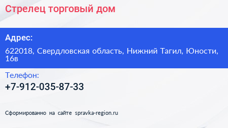Стрелец, торговый дом по адресу 622018, Свердловская область, Нижний Тагил, Юности, 16в в дальнейшем Организация, размещена в следующих категориях: