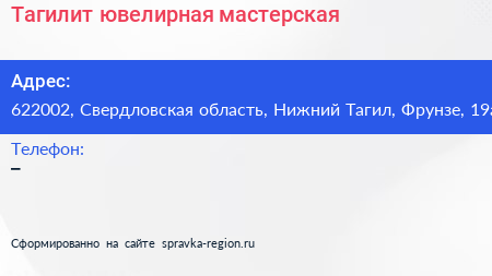 Тагилит, ювелирная мастерская по адресу 622002, Свердловская область, Нижний Тагил, Фрунзе, 19а в дальнейшем Организация, размещена в следующих категориях: