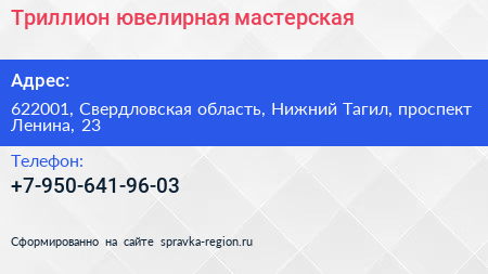 Триллион, ювелирная мастерская по адресу 622001, Свердловская область, Нижний Тагил, проспект Ленина, 23 в дальнейшем Организация, размещена в следующих категориях: