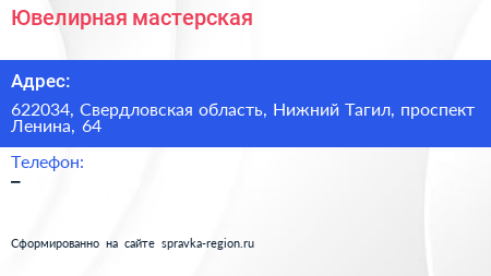 Ювелирная мастерская по адресу 622034, Свердловская область, Нижний Тагил, проспект Ленина, 64 в дальнейшем Организация, размещена в следующих категориях: