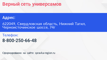 Верный, сеть универсамов по адресу 622049, Свердловская область, Нижний Тагил, Черноисточинское шоссе, 74г в дальнейшем Организация, размещена в следующих категориях:
