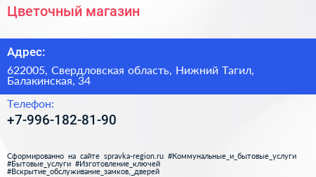 Цветочный магазин по адресу 622005, Свердловская область, Нижний Тагил, Балакинская, 34 в дальнейшем Организация, размещена в следующих категориях: