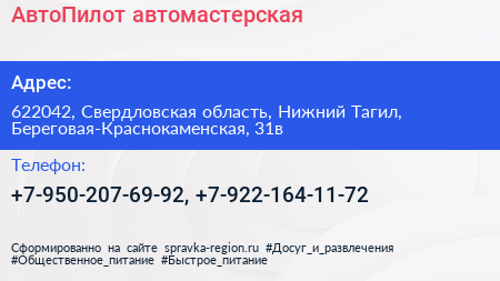 АвтоПилот, автомастерская по адресу 622042, Свердловская область, Нижний Тагил, Береговая-Краснокаменская, 31в в дальнейшем Организация, размещена в следующих категориях: