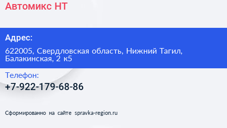 Автомикс НТ по адресу 622005, Свердловская область, Нижний Тагил, Балакинская, 2 к5 в дальнейшем Организация, размещена в следующих категориях: