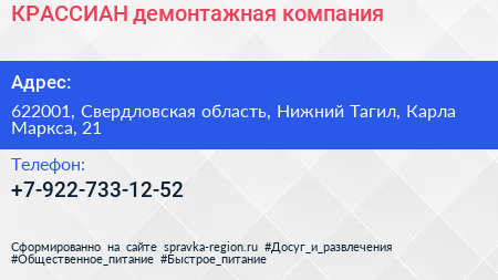 КРАССИАН, демонтажная компания по адресу 622001, Свердловская область, Нижний Тагил, Карла Маркса, 21 в дальнейшем Организация, размещена в следующих категориях: