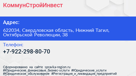 КоммунСтройИнвест по адресу 622034, Свердловская область, Нижний Тагил, Октябрьской Революции, 38 в дальнейшем Организация, размещена в следующих категориях: