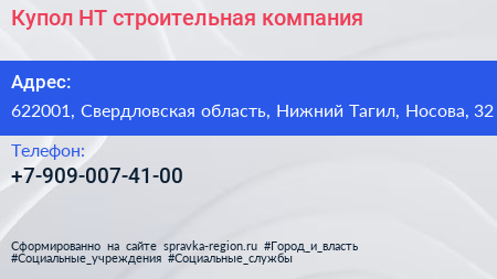 Купол НТ, строительная компания по адресу 622001, Свердловская область, Нижний Тагил, Носова, 32 в дальнейшем Организация, размещена в следующих категориях: