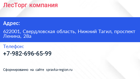 ЛесТорг, компания по адресу 622001, Свердловская область, Нижний Тагил, проспект Ленина, 28а в дальнейшем Организация, размещена в следующих категориях: