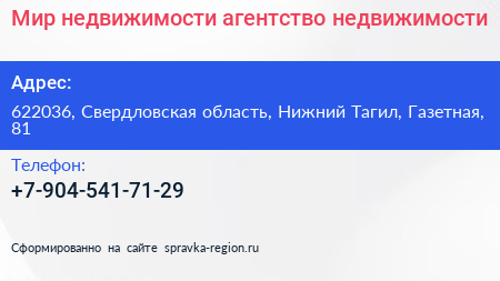 Мир недвижимости, агентство недвижимости по адресу 622036, Свердловская область, Нижний Тагил, Газетная, 81 в дальнейшем Организация, размещена в следующих категориях: