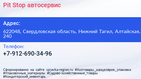 Pit Stop, автосервис по адресу 622048, Свердловская область, Нижний Тагил, Алтайская, 240 в дальнейшем Организация, размещена в следующих категориях: