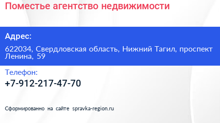 Поместье, агентство недвижимости по адресу 622034, Свердловская область, Нижний Тагил, проспект Ленина, 59 в дальнейшем Организация, размещена в следующих категориях: