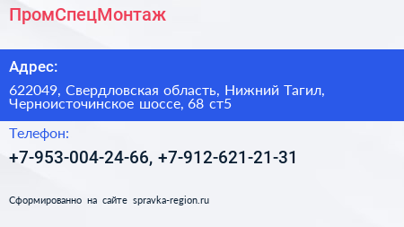ПромСпецМонтаж по адресу 622049, Свердловская область, Нижний Тагил, Черноисточинское шоссе, 68 ст5 в дальнейшем Организация, размещена в следующих категориях: