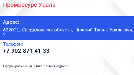 Промресурс Урала по адресу 622001, Свердловская область, Нижний Тагил, Уральская, 9 в дальнейшем Организация, размещена в следующих категориях: