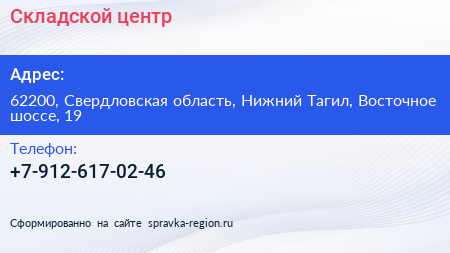 Складской центр по адресу 62200, Свердловская область, Нижний Тагил, Восточное шоссе, 19 в дальнейшем Организация, размещена в следующих категориях: