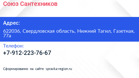 Союз Сантехников по адресу 622036, Свердловская область, Нижний Тагил, Газетная, 77а в дальнейшем Организация, размещена в следующих категориях: