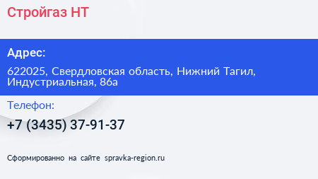 Стройгаз НТ по адресу 622025, Свердловская область, Нижний Тагил, Индустриальная, 86а в дальнейшем Организация, размещена в следующих категориях: