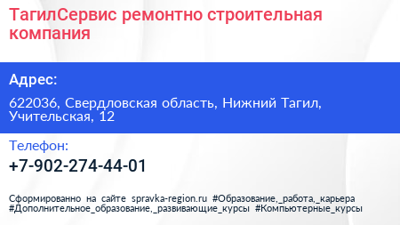ТагилСервис, ремонтно-строительная компания по адресу 622036, Свердловская область, Нижний Тагил, Учительская, 12 в дальнейшем Организация, размещена в следующих категориях: