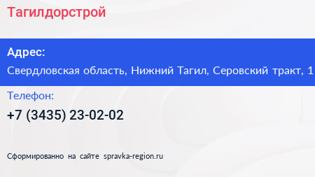 Тагилдорстрой по адресу Свердловская область, Нижний Тагил, Серовский тракт, 1 в дальнейшем Организация, размещена в следующих категориях: