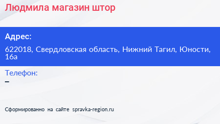 Людмила, магазин штор по адресу 622018, Свердловская область, Нижний Тагил, Юности, 16а в дальнейшем Организация, размещена в следующих категориях: