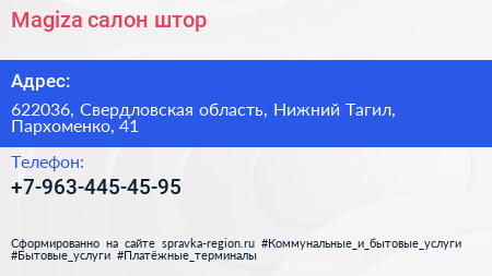 Magiza, салон штор по адресу 622036, Свердловская область, Нижний Тагил, Пархоменко, 41 в дальнейшем Организация, размещена в следующих категориях: