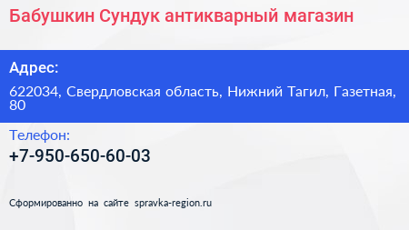 Бабушкин Сундук, антикварный магазин по адресу 622034, Свердловская область, Нижний Тагил, Газетная, 80 в дальнейшем Организация, размещена в следующих категориях: