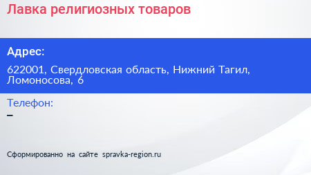 Лавка религиозных товаров по адресу 622001, Свердловская область, Нижний Тагил, Ломоносова, 6 в дальнейшем Организация, размещена в следующих категориях:
