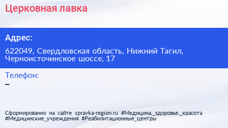 Церковная лавка по адресу 622049, Свердловская область, Нижний Тагил, Черноисточинское шоссе, 17 в дальнейшем Организация, размещена в следующих категориях: